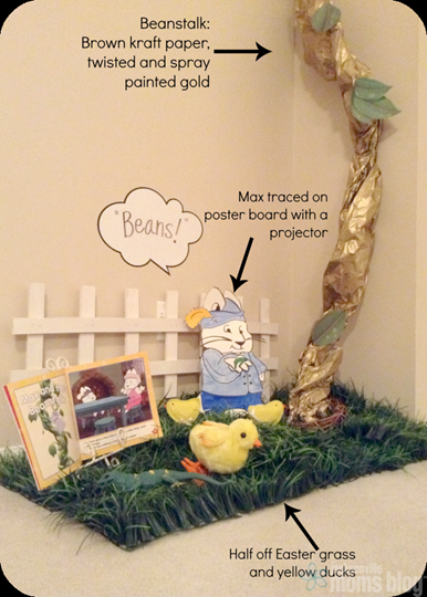 Can’t find any ideas? Turn to a book! I spent more time than I care to admit searching Pinterest for Max and Ruby party ideas. Finally, I realized I would have to come up with my own ideas. I decided to take my kid’s favorite Max and Ruby books and recreate them around the house. I put a small pink phone on an end table and made a bus stop sign, and called it “Max misses the Bus.” I borrowed my projector from work, hooked up my laptop to it and fired up Google Image Search. I hung a poster board on my wall and traced Max dressed up like Jack from Jack and the Beanstalk. I easily fashioned a beanstalk out of brown paper and a little bit of gold spray paint. “Max and the Beanstalk” stayed up for months because the kids absolutely loved it!