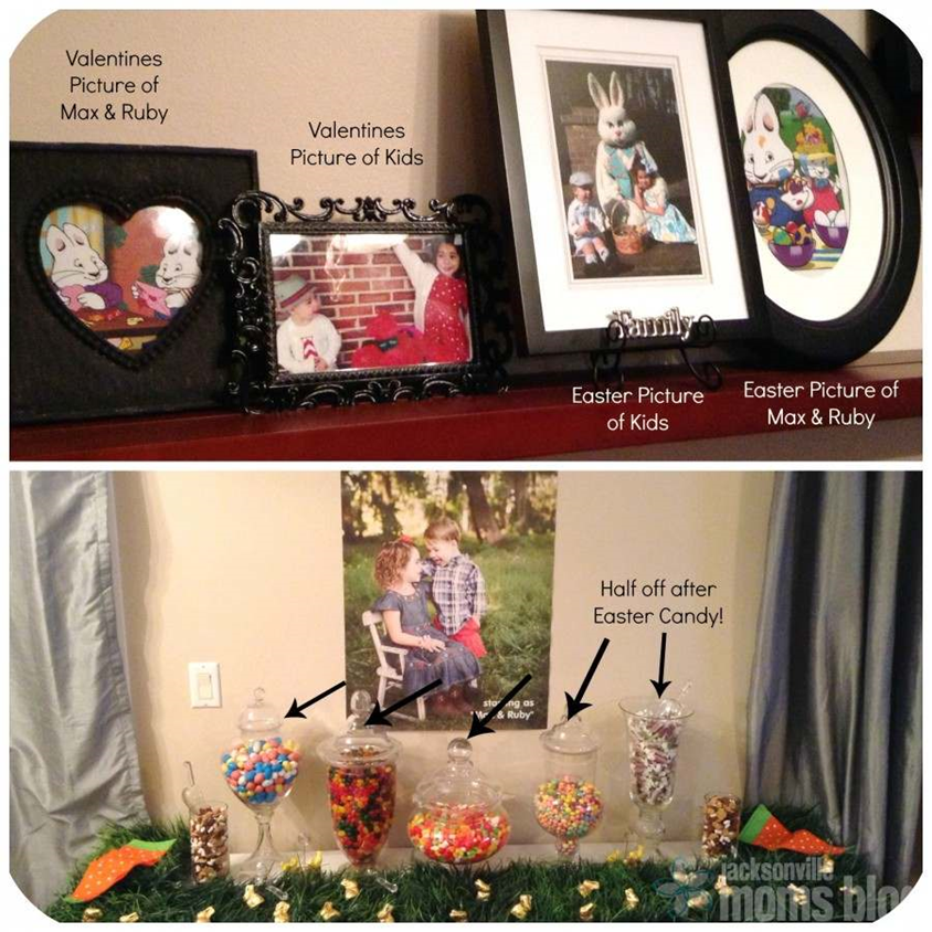 Decorate with inexpensive pictures of your kids. For a Max and Ruby party, I used pictures of my kids at Valentines Day, Easter and Christmas and put them in frames next to pictures of Max and Ruby on the same holidays. I printed out pictures I found online (I love Google Image Search) and cut them to size. I only paid for the 4×6 pictures I used, so I’m certain I only spent a $1 to decorate my wall shelves.